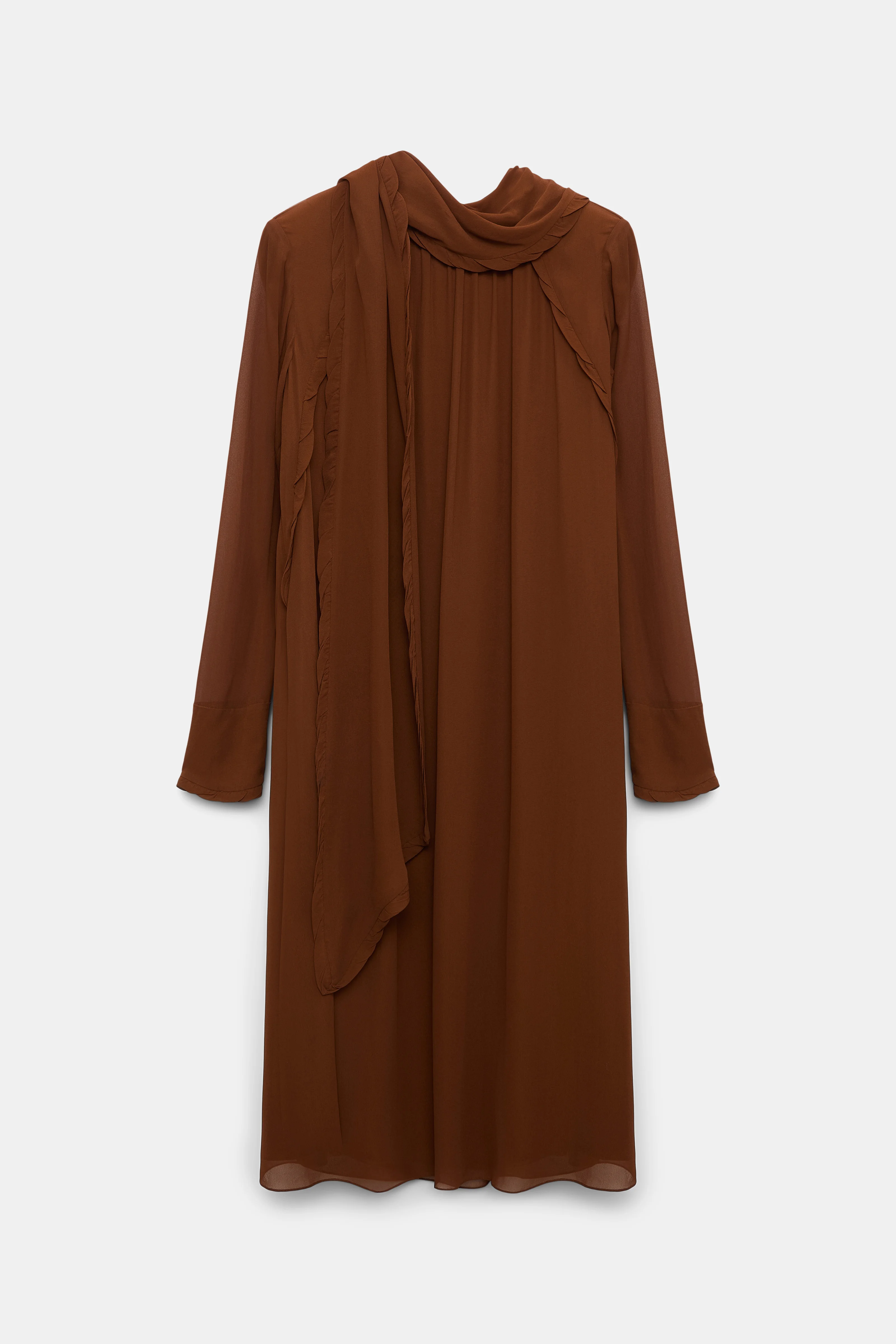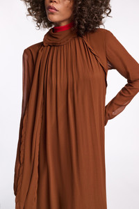 The dress is cut with generous volume in ethereal georgette and has a wrap around scarf neckline. Accentuated padded shoulders add structure and sophistication to its draped silhouette. Material & Care - 100 % Viscose - Turtleneck scarf dress in georgette - Generous volume - Accentuated padded shoulders - Twisted edge details on the scarf, dividing seams and cuffs - Long scarf - Dry clean only - No optical brighteners - Do not expose to extreme light - Shield from sharp items Size & Fit - Our Model is 179cm tall and wears a size 2. - Slight dropped shoulders - Slim sleeves - Generous body volume