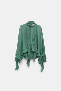 The dynamic blouse is made from double silk georgette and comes with a matching scarf. The blouse has an oversized, cape-like drape and is finished with ruffle flounces at the cuffs and hem. Material & Care - 100 % Silk - Cape-style blouse in silk double georgette - Round neckline - Center front slit - Integrated top in single georgette - Separate scarf in single georgette - Handwaschprogramm / Maschinenwasche - Mit ahnlichen Farben waschen - Remove all detachable parts before cleaning - Contains non-textile parts of animal origin Size & Fit - Our model is 178 cm tall and wears a size S - Oversized - Voluminous drape