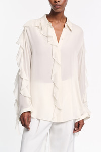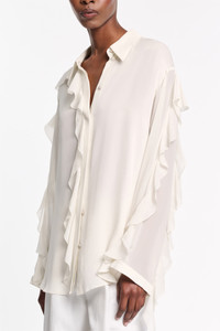 The ruffle blouse is made from double- and single silk georgette and comes with a matching scarf. The blouse has an oversized fit and cascading ruffles on the sleeves. Material & Care - 100 % Silk - Silk double- and single georgette blouse with ruffles - Classic collar - Ruffles on the sleeves - Hidden button placket - Separate scarf - Hand wash program / Machine wash - Wash with similar colors Size & Fit - Our model is 179 cm tall and wears a size S - Oversized - Dropped shoulders