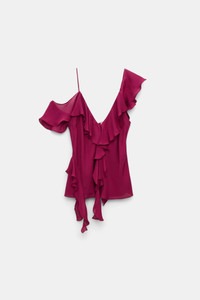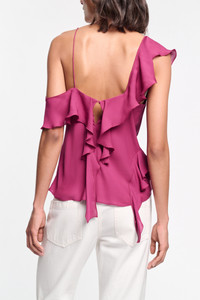 The ruffle top is made from double silk georgette and has spaghetti- and ruffle straps. The top is fitted and has a soft bias drape. Material & Care - 100 % Silk - Silk double georgette top with ruffles - Spaghetti- and ruffle straps - Bias cut body - Handwaschprogramm / Maschinenwasche - Mit ahnlichen Farben waschen Size & Fit - Our model is 178 cm tall and wears a size S - Fitted