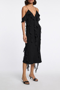 The ruffle dress is made from double- and single silk georgette and has double straps. The dress is fitted and has a soft bias drape. Material & Care - 100 % Silk - Silk double- and single georgette dress with ruffles - Spaghetti- and ruffle straps - Bias cut - Lined - Hand wash program / Machine wash - Wash with similar colors Size & Fit - Our model is 178 cm tall and wears a size S - Fitted