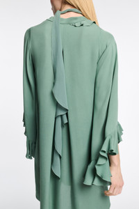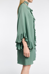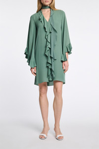The ruffle mini dress is made from double- and single silk georgette and comes with a matching scarf. The dress has a relaxed fit and wide sleeves with ruffles at the cuffs. Material & Care - 100 % Silk - Silk double- and single georgette mini dress with ruffles - V-neckline with cascading ruffle - Voluminous caftan sleeves with ruffles - Box pleat at the back - Separate flounce scarf made of single georgette - Hand wash program / Machine wash - Wash with similar colors Size & Fit - Our model is 180 cm tall and wears a size S - Relaxed fit with wide sleeves - Fitted shoulders