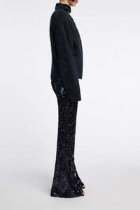 All eyes on you - in sequins! The pants feature an allover sequin flower design and fit and flare bootcut leg. The pants have a hidden side zip closure. Material & Care - 95 % Viscose, 5 % Elastane - Bootcut pants with sequin flower design - High waist - In-seam side zip closure Size & Fit - Our model is 179 cm tall and wears a size S - Form-fitting through the knee - Bootcut