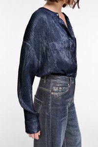 The collarless blouse is made from silk lame chiffon and has large patch pockets. The blouse has soft gathering at the neckline and an oversized, boxy drape. Material & Care - 74 % Silk, 26 % Metalfiber - Boxy silk lame chiffon blouse with patch pockets - Gathers at the neckline - Decorative snaps - Calf leather lining - Cuban mid-heel - Tunit sole embossed with CATCH HER. IF YOU CAN. Size & Fit - Our model is 179 cm tall and wears a size S - Oversized - Dropped shoulders - Dropped shoulders