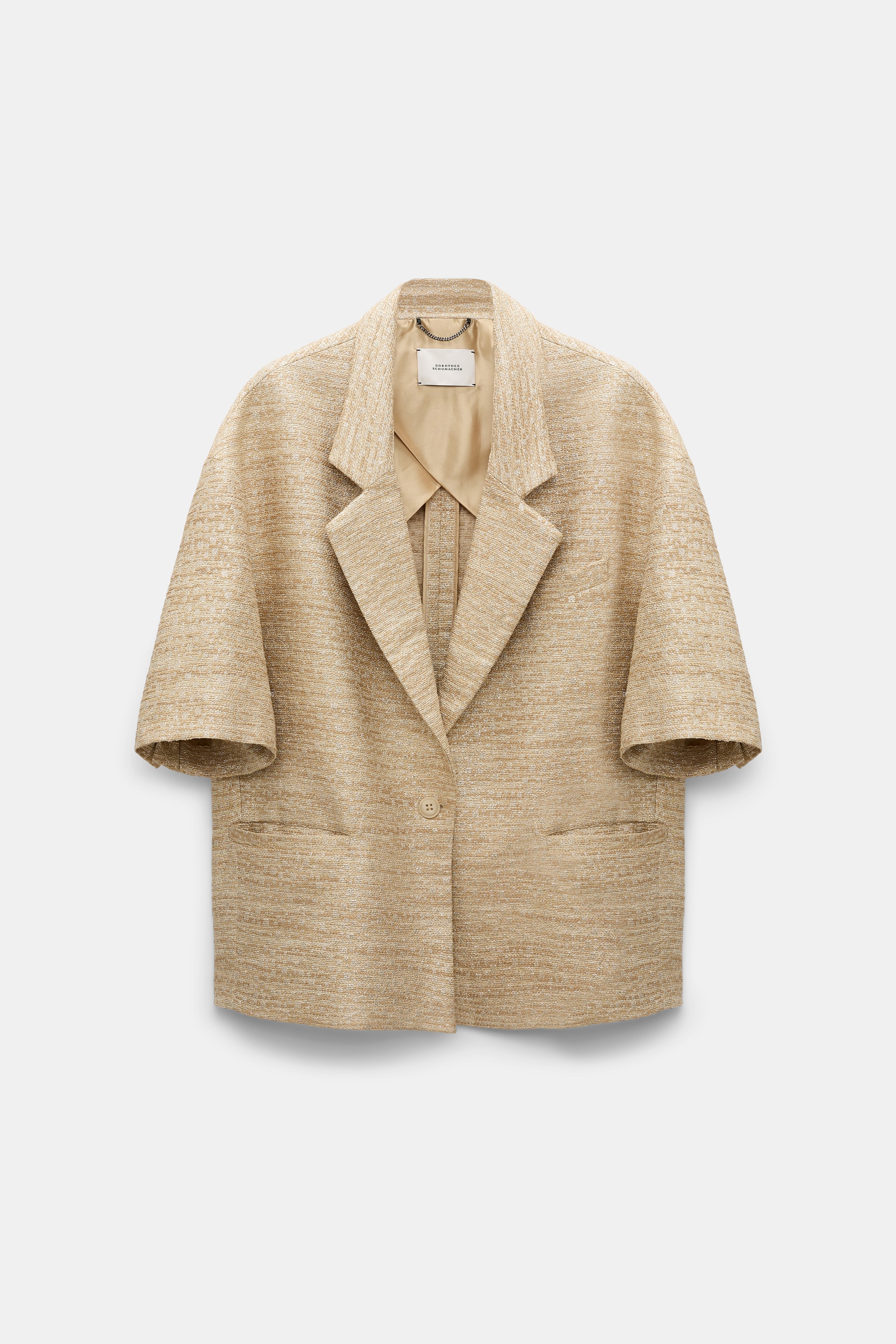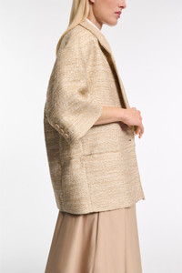 The perfect mix of shine & sophistication: The Lurex-tweed jacket has an oversized silhouette and 3/4-length sleeves. The jacket can be worn as a set with the matching shift dress. Material & Care - 49 % Polyester, 35 % Cotton, 11 % Polyacrylic, 3 % metallized polyester, 2 % Polyamide - Lurex-tweed short sleeve jacket. - Dropped notched collar - Chest pocket - Slit cuffs - Welt pockets - Mild wash / Delicates - Wash with similar colors - Caution, may run - Contains non-textile parts of animal origin Size & Fit - Our model is 178cm tall and wears a size 2 - Oversized - Cropped sleeves