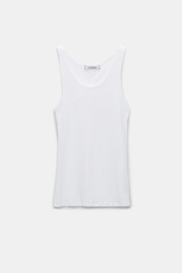 The ribbed cotton tank top has a scoop neckline and thin straps. The fitted style has a center back seam. Material & Care - 100 % Cotton - Ribbed cotton tank top - Scoop neckline and thin straps with binding - Center back seam - Double-needle topstitching on the hem - WE CARE - This item is finished according to STANDARD 100 by OEKO-TEX, 22.0.98928 Hohenstein HTTI - Hand wash program / Machine wash cold - Wash with similar colors Size & Fit - Fitted - This item runs small - we recommend choosing one size larger