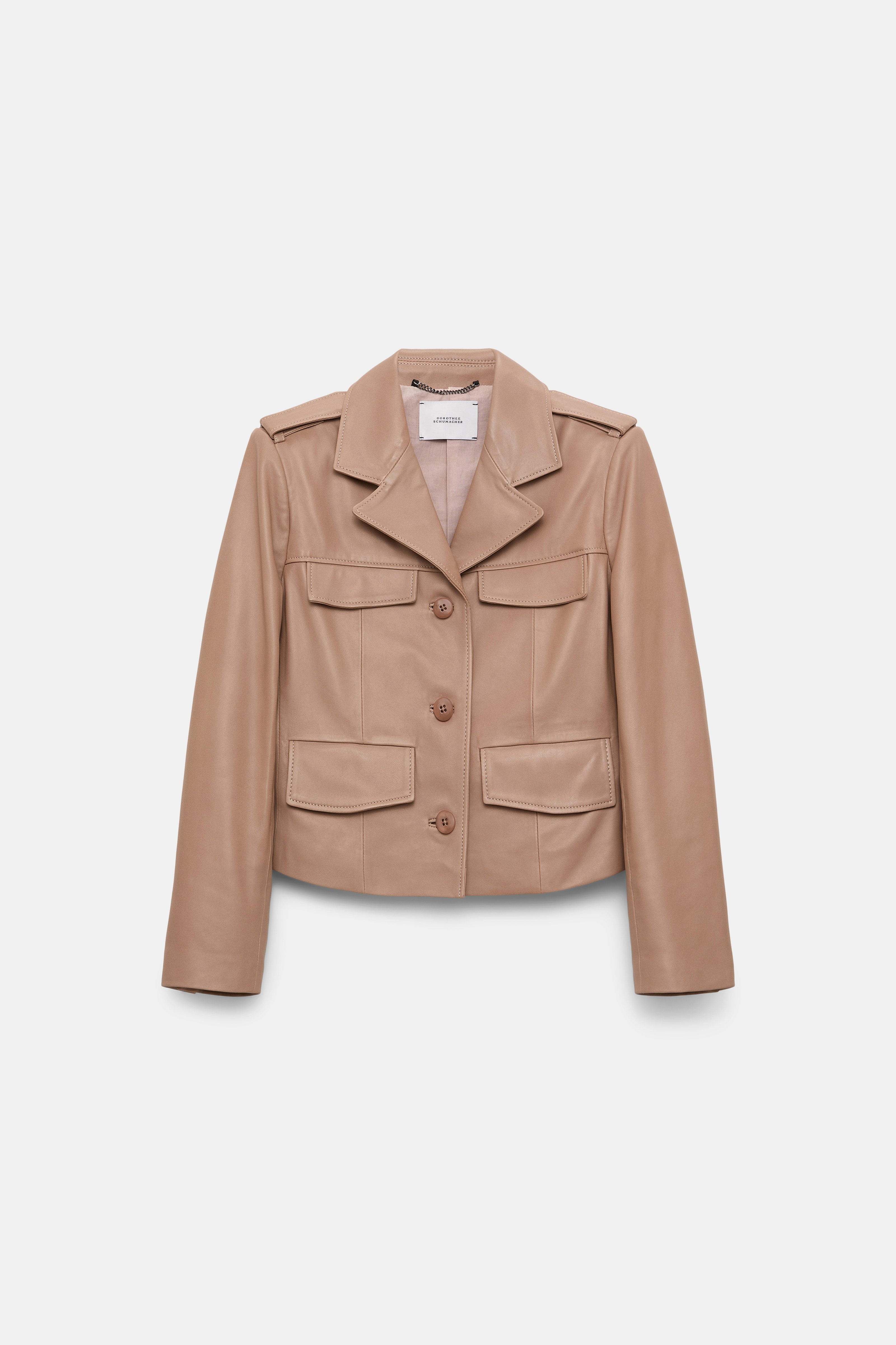 Luxury in lambskin: The cropped leather jacket features a slim fit and four flap pockets. The jacket has a peitite notched collar and epaulettes. Material & Care - 100 % Leather (lamb) - Cropped lambskin jacket - Notched collar - Flap pockets - Epaulettes - Back yoke - No dry cleaning - Do not wash - Colour changes in product may result from strong light irradiation - This garment may transfer onto light coloured materials Size & Fit - Our model is 178cm tall and wears a size 2 - Fitted - If a wider fit is desired, we recommend choosing one size larger