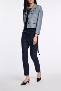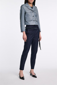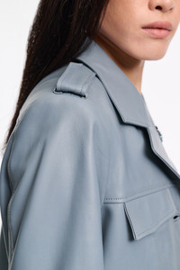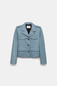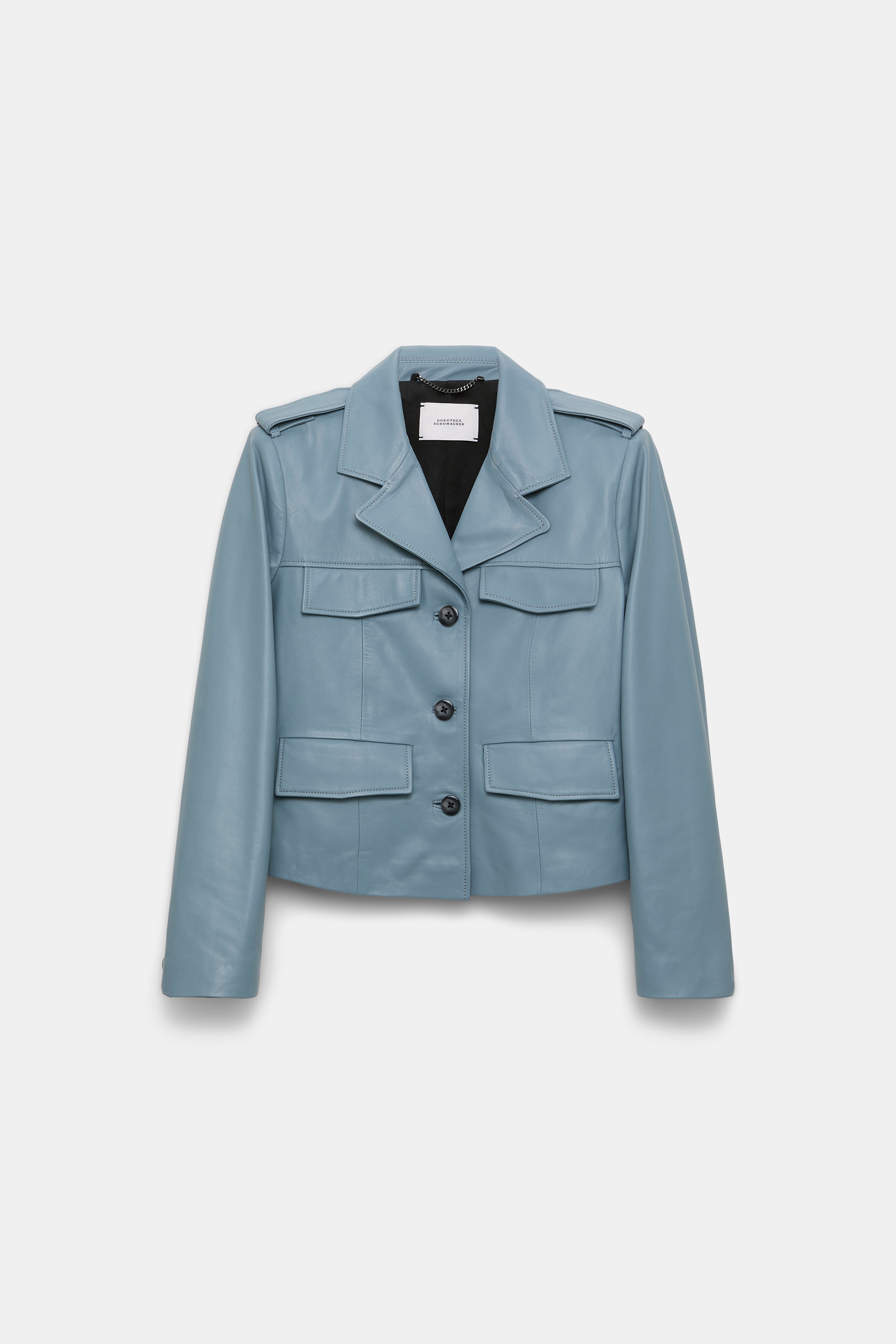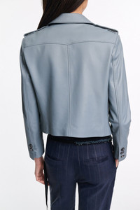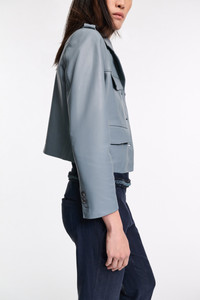 Luxury in lambskin: The cropped leather jacket features a slim fit and four flap pockets. The jacket has a peitite notched collar and epaulettes. Material & Care - 100 % Leather (lamb) - Cropped lambskin jacket - Notched collar - Flap pockets - Epaulettes - Back yoke - No dry cleaning - Do not wash - Colour changes in product may result from strong light irradiation - This garment may transfer onto light coloured materials Size & Fit - Our model is 180cm tall and wears a size 2 - Fitted - Cropped sleeves - If a wider fit is desired, we recommend choosing one size larger