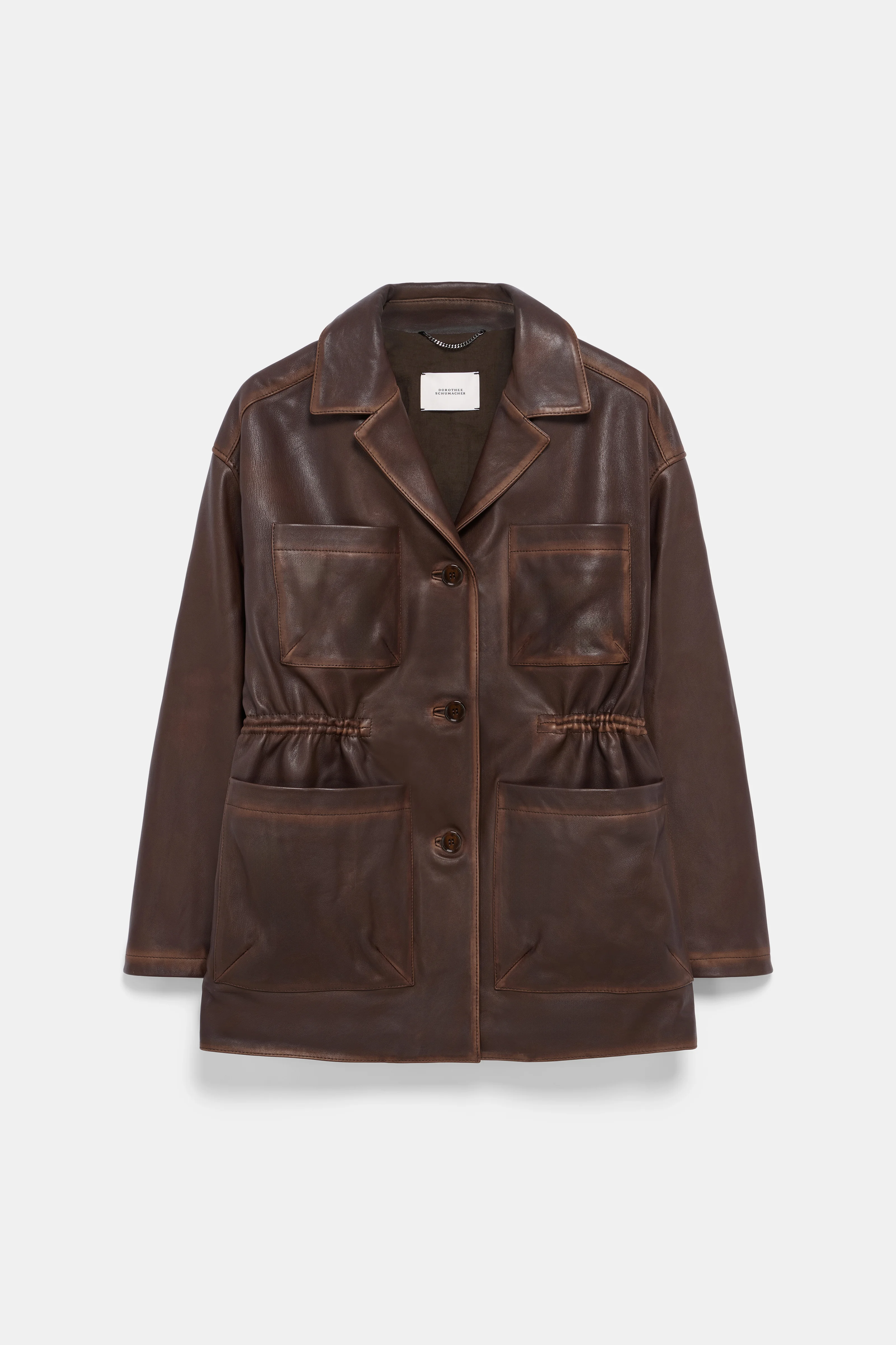 The leather jacket is slightly oversized and has a vintage look finish. The jacket has a notched collar and nipped drawstring waist. Material & Care - 100 % Leather (lamb) - Vintage look leather jacket - Notched collar - Patch pockets - Drawstring waist - Slit cuffs - Inside pocket - Lined - Do not wash - No dry cleaning - This garment my transfer onto light coloured materials Size & Fit - Our Model is 178cm tall and wears a size 2. - Slightly oversized