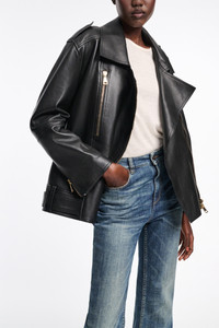 The biker jacket is made from soft Nappa leather and has a slightly oversized silhouette. The jacket has classic biker styling like zip pockets, latch details and epaulettes. Material & Care - 100 % Leather (lamb) - Nappa leather biker jacket - Notched collar - Zippered pockets - Flap pockets - Epaulettes - Side latches are held by belt loops - Flap pocket at the back of the waistband Size & Fit - Slightly oversized