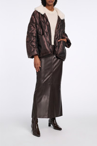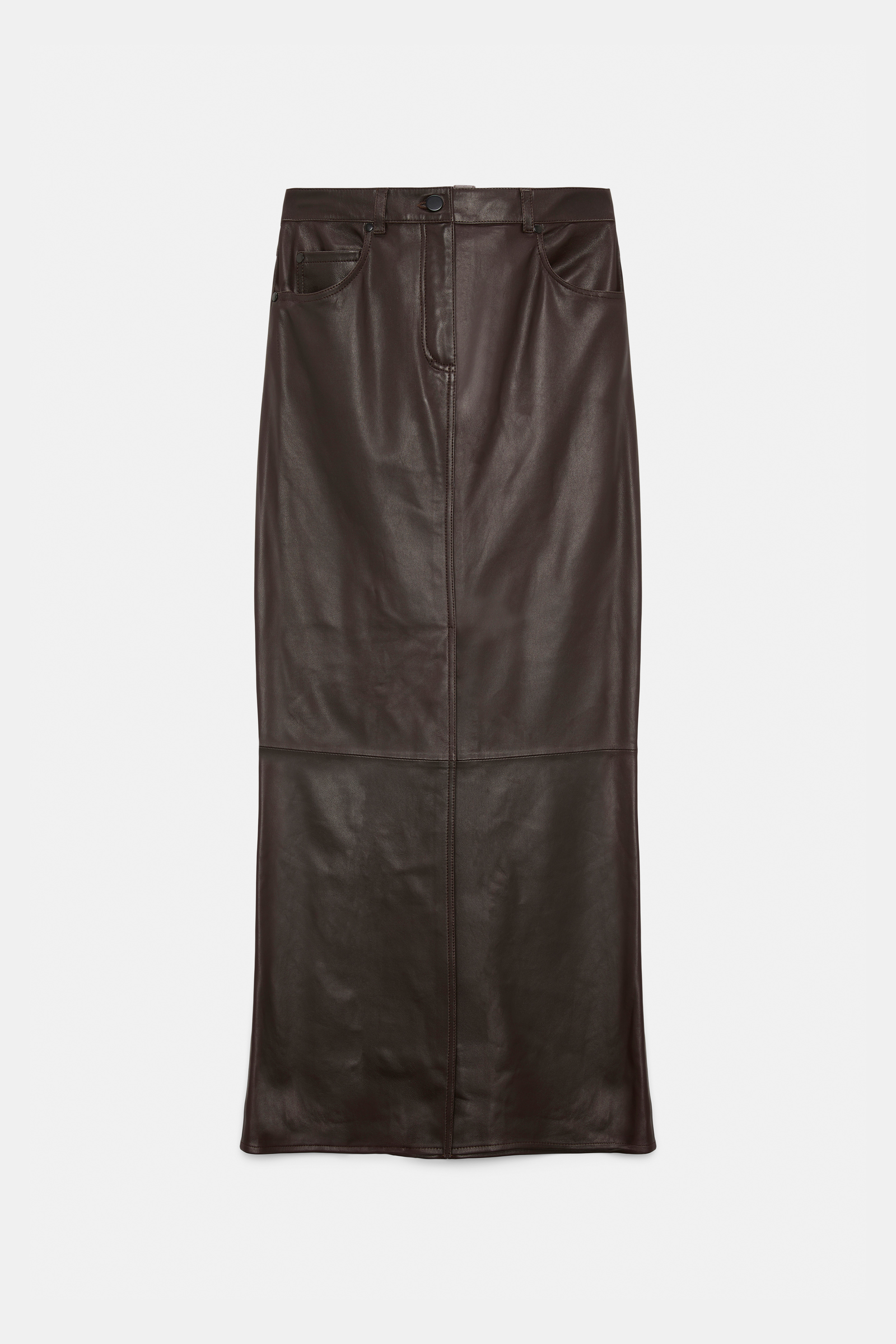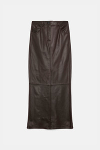 Love it. In leather. The leather skirt has classic 5-pocket styling and a loop detail on the back,. Material & Care - 100 % Leather (lamb) - Leather skirt - Classic 5-pocket styling - Zip fly closure - Center front slit - Center back loop - Back yoke - No dry cleaning - Do not wash - Caution, may run