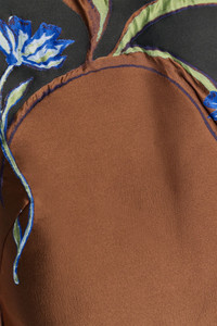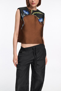Our Atelier & Italian artistry at work: The positioned print becomes a patchwork combination on the round collar cloque jacquard shell. The flowy solid cocoa counterpart falls into a loosely fitted drape. Material & Care - 92 % Polyester, 8 % Polyamide - Top in three-dimensional cloque jacquard - Positioned print - Padded shoulders - Hand wash cold / Machine wash old - Wash with similar colors Size & Fit - Our model is 179cm tall and wears a size 2 - Loosely fitted - Sleeveless