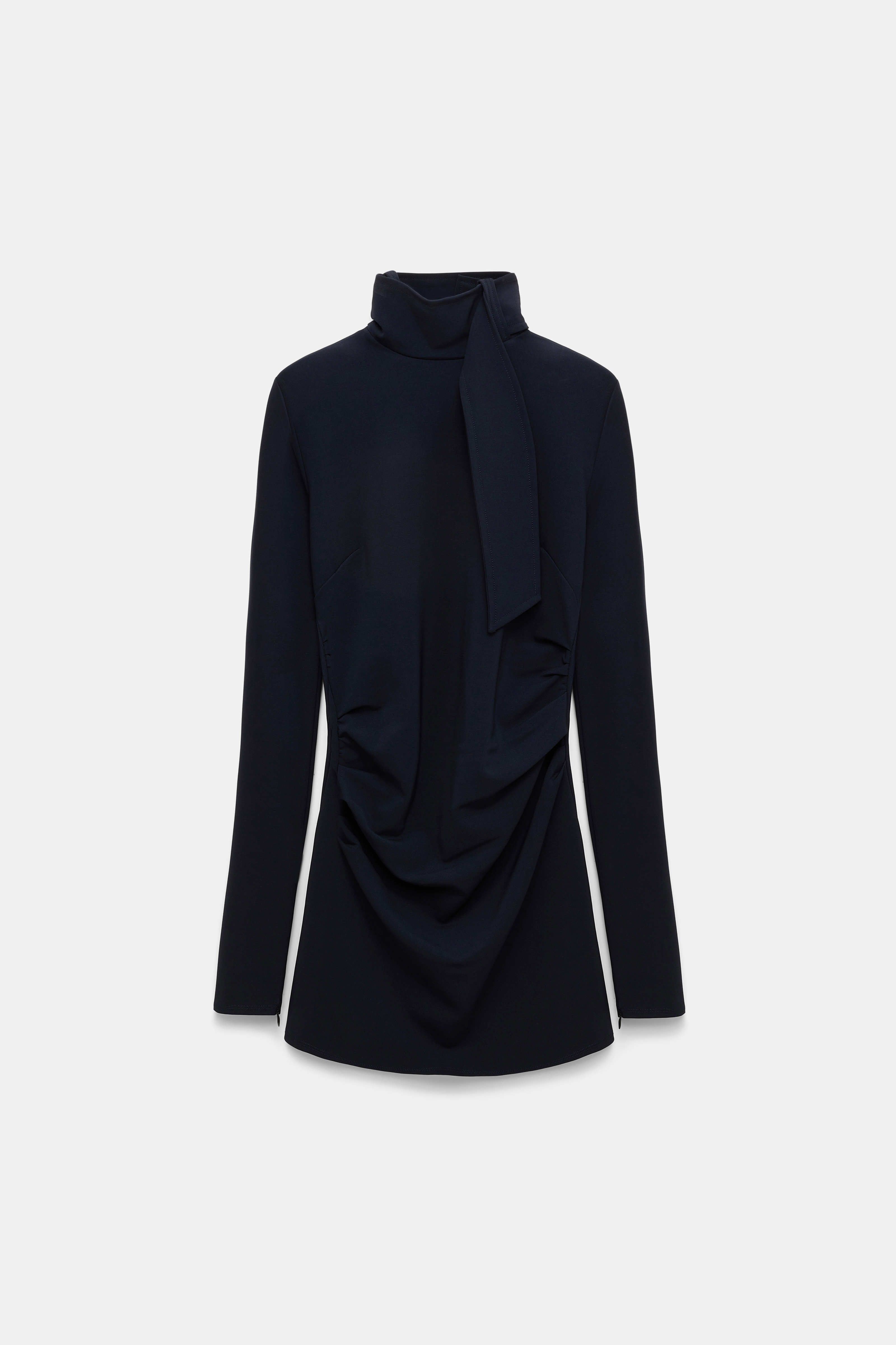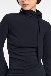 The turtleneck top has a scarf detail which wraps around the neckline and drapes through a loop. The turtleneck has gathered pleating on the side seams and a center back zip closure. Material & Care - 75 % Viscose, 20 % Polyamide, 5 % Elastane - Turtleneck top with loop and scarf detail - Soft gathering on the side seams - Topstitching - Double-needle stitching on the cuffs - Center back zip closure - WE CARE - This item is finished according to STANDARD 100 by OEKO-TEX, 22.0.98928 Hohenstein HTTI Size & Fit - Our model is 179 cm tall and wears a size S - Fitted - Fitted shoulders