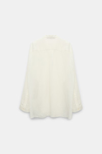 The collarless blouse is made from a striped viscose-silk mix and has ruffles down the front. The blouse comes with a matching scarf, which falls into a soft flounce at the ends. Material & Care - 84 % Viscose, 16 % Silk - Blouse with ruffles in striped viscose-silk - Stand collar - Hidden button placket - Separate scarf Size & Fit - Oversized - Dropped shoulders