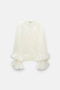 Double the flounce, double the fun: The fitted blouse is crafted in striped organdy voile and features dynamic flounce cuffs. The blouse has a short stand collar and flared sleeves. Material & Care - 84 % Viscose, 16 % Silk - Striped organdy voile blouse - Short stand collar - Hidden button placket - Double-layer, flared sleeves with set-in flounces - Very mild fine wash wool-silk cycle / Cold wash / No hand wash - Wash with similar colors - Contains non-textile parts of animal origin Size & Fit - Our model is 178cm tall and wears a size 2 - Fitted - Flared caftan sleeves - Fitted shoulders