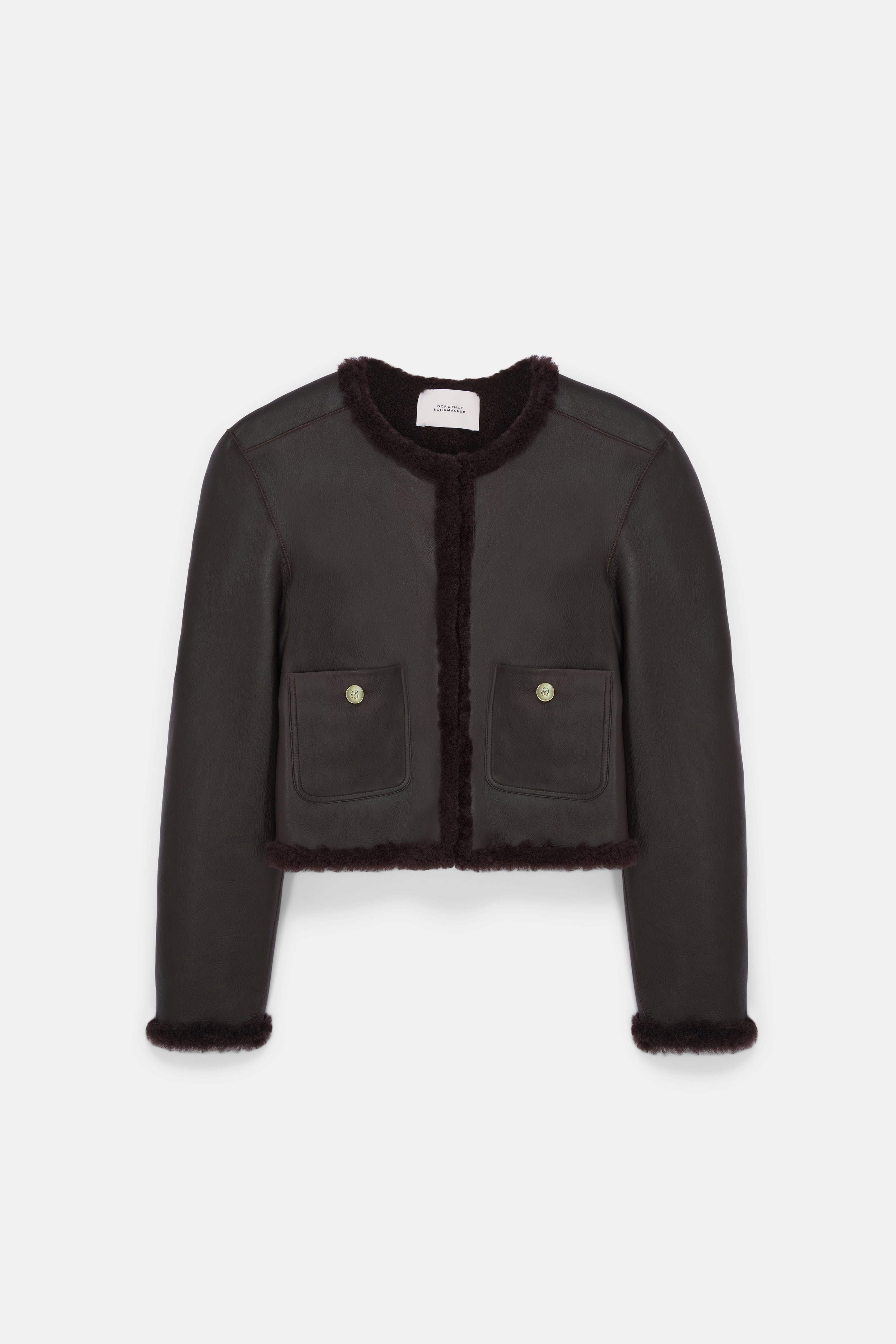 The cropped shearling jacket is reversible and features gold-tone buttons and a slight A-line shape. The luxuriously cozy style is collarless and has two patch pockets. Material & Care - 100 % Fur (lamb) - Reversible shearling jacket - Welt pockets - Patch pockets - Gold-tone buttons - Hand wash cold / Machine wash old - Wash with similar colors Size & Fit - Our model is 178cm tall and wears a size 2 - Slight A-line