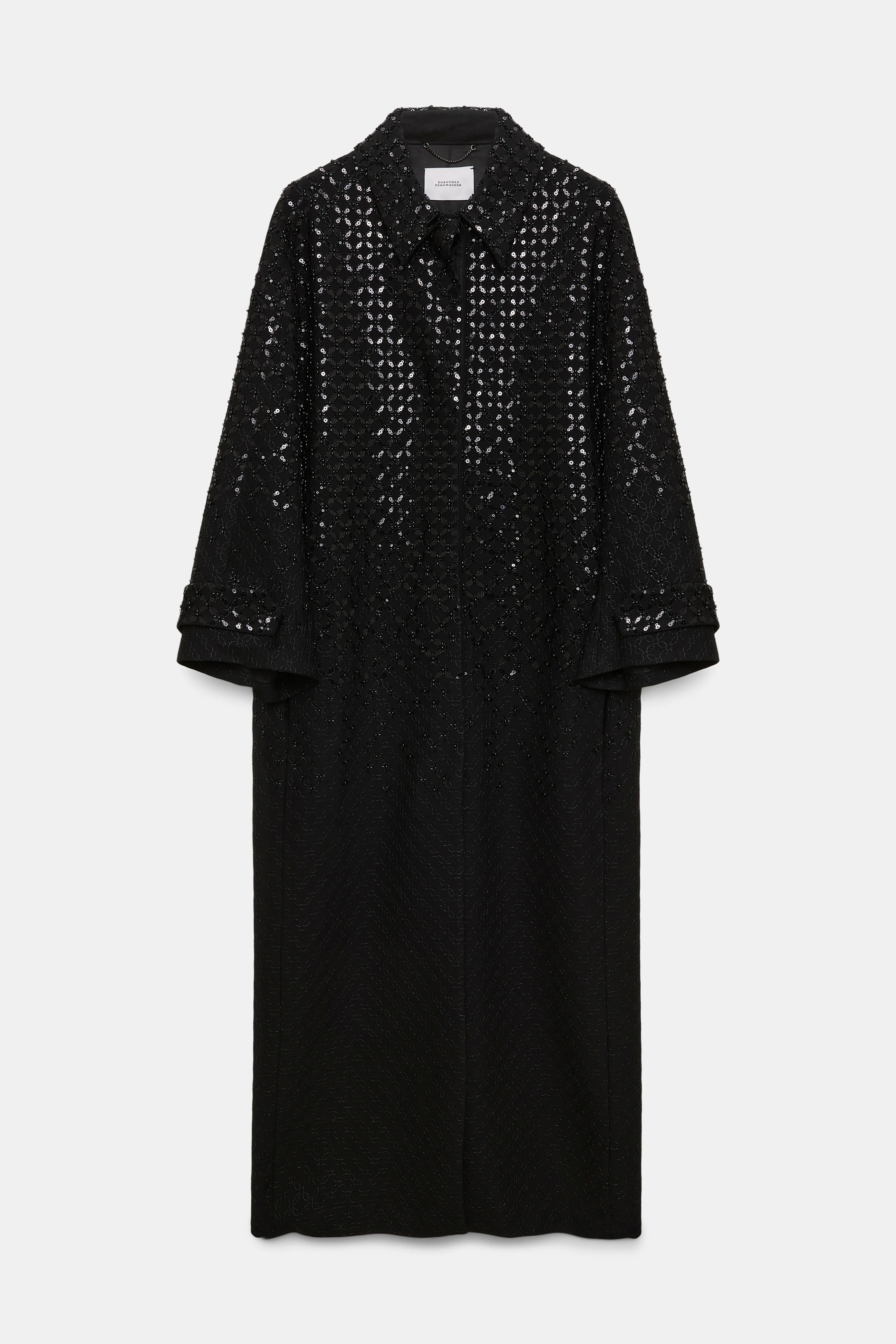 All dressed up - in Punto Milano: The coat is made from Punto Milano and is embellished with floral sequin patterning. The slightly oversized silhouette has hidden button closures. Material & Care - 67 % Viscose, 28 % Polyamide, 5 % Elastane - Sequin embellished coat in Punto Milano - Hidden button placket - Tabbed sleeves - Lined - Dry clean only - No optical brighteners - Do not expose to extreme light - Shield from sharp items Size & Fit - Our Model is 178cm tall and wears a size 2. - Cropped sleeves - Slightly oversized