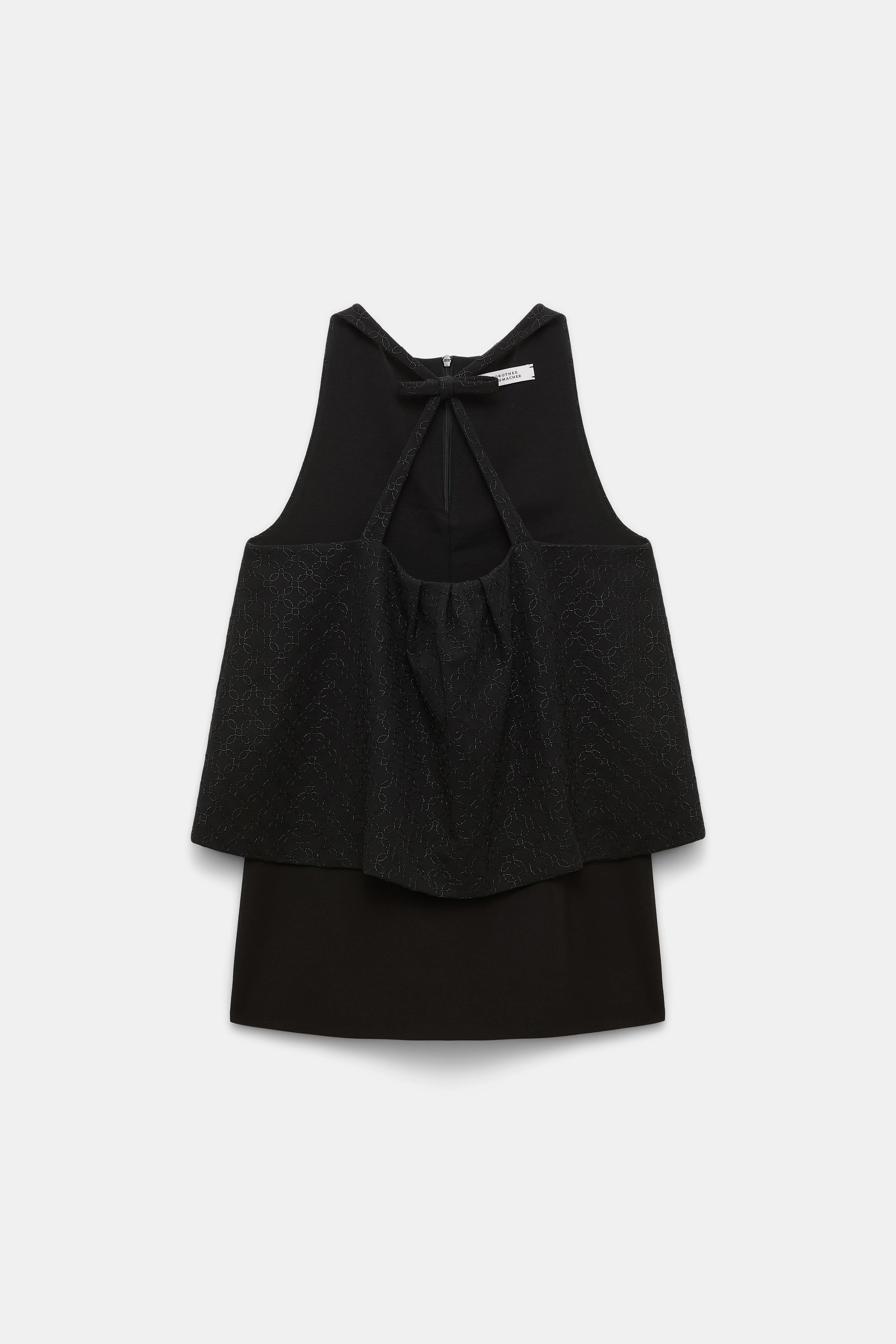 The tank top is made from Punto Milano and has a cutout neckline and bow detail. The top has a layered look with intricate floral embroidery. Material & Care - 62 % Viscose, 32 % Polyamide, 6 % Elastane - Tank top with bow detail - Double layer body - Cropped layer with allover embroidery - Special strap patterning with bow detail - Dry clean only - No optical brighteners - Do not expose to extreme light - Shield from sharp items Size & Fit - Our Model is 178cm tall and wears a size 2. - Cropped flared volume - Fitted long top underneath