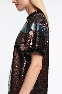 This dress was made for dancing: The short sleeve shift is covered in sequins with contrast stripe patterning at the top and hem. The mini-length style has a round neckline and cuffs with 3D sequin trim. Material & Care - 100 % Cotton - Striped sequin shift dress - Round neckline - Neckline and cuffs with 3D sequins - Back zip closure with long pull - Dry clean only - No optical brighteners - Do not expose to extreme light - Shield from sharp items Size & Fit - Our model is 178cm tall and wears a size 2 - Slim, loosely fitted silhouette - Short sleeves
