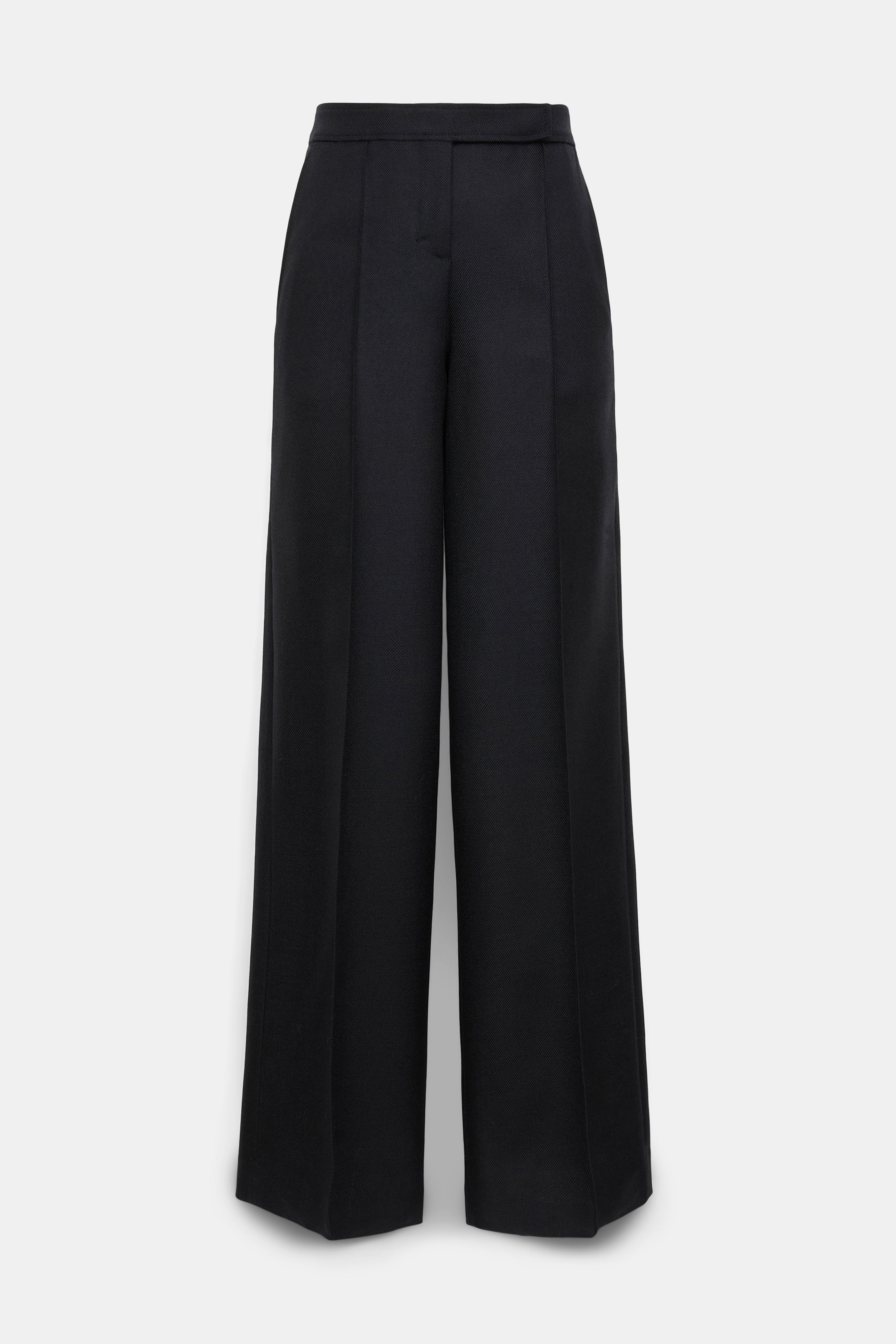 Made to match: The wide leg pants are made from virgin wool and come with an unfinished hemline for custom tailoring The pants can be worn as a set with the matching coat and shell. Material & Care - 100 % Virgin Wool - Wide leg pants in virgin wool - Wide waistband with extended tab closure - Diagonal side pockets - Piped trim - Back welt pockets - Comes with an unfinished hemline so you can custom tailor to your desired length - Hand wash cold / Machine wash old - Wash with similar colors Size & Fit - Our model is 180cm tall and wears a size 2 - Wide leg