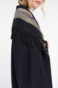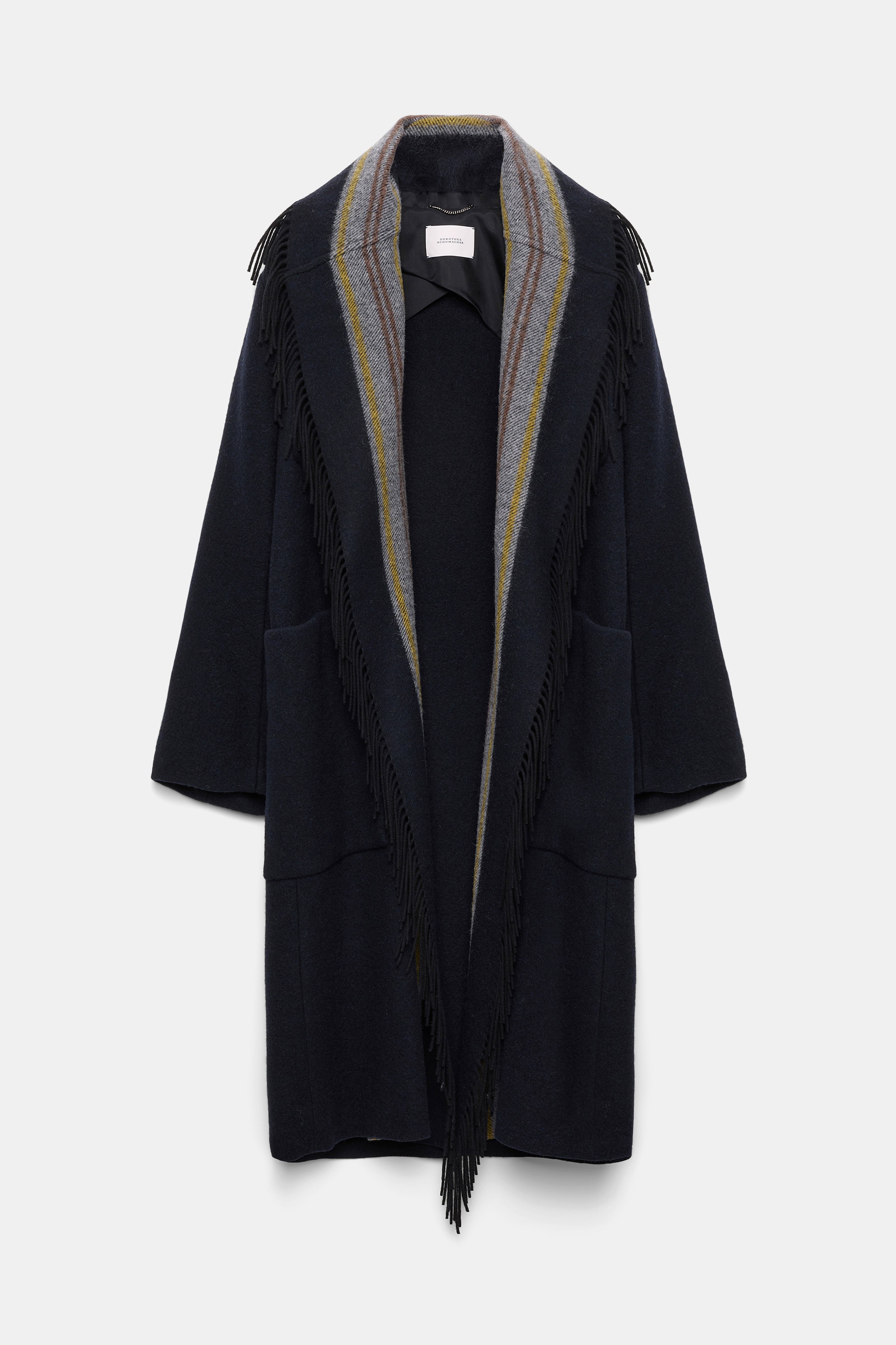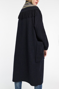The wool blend coat has a long, oversized silhouette and soft fringe trim. The coat has a shawl collar and is detailed with contrast striped lining, which is exposed on the collar. Material & Care - 70 % Wool, 20 % Polyamide, 5 % Polyacrylic, 5 % Other Fibres - Long, oversized coat with shawl collar - Striped lining is exposed at the collar - Fringe trim on the front and collar - Patch pockets - WE CARE - Fabric supplier produces according to 4sustainability - WE CARE - The wool content is produced in accordance with the Global Recycled Standard (GRS) Size & Fit - Our model is 179 cm tall and wears a size S - Oversized