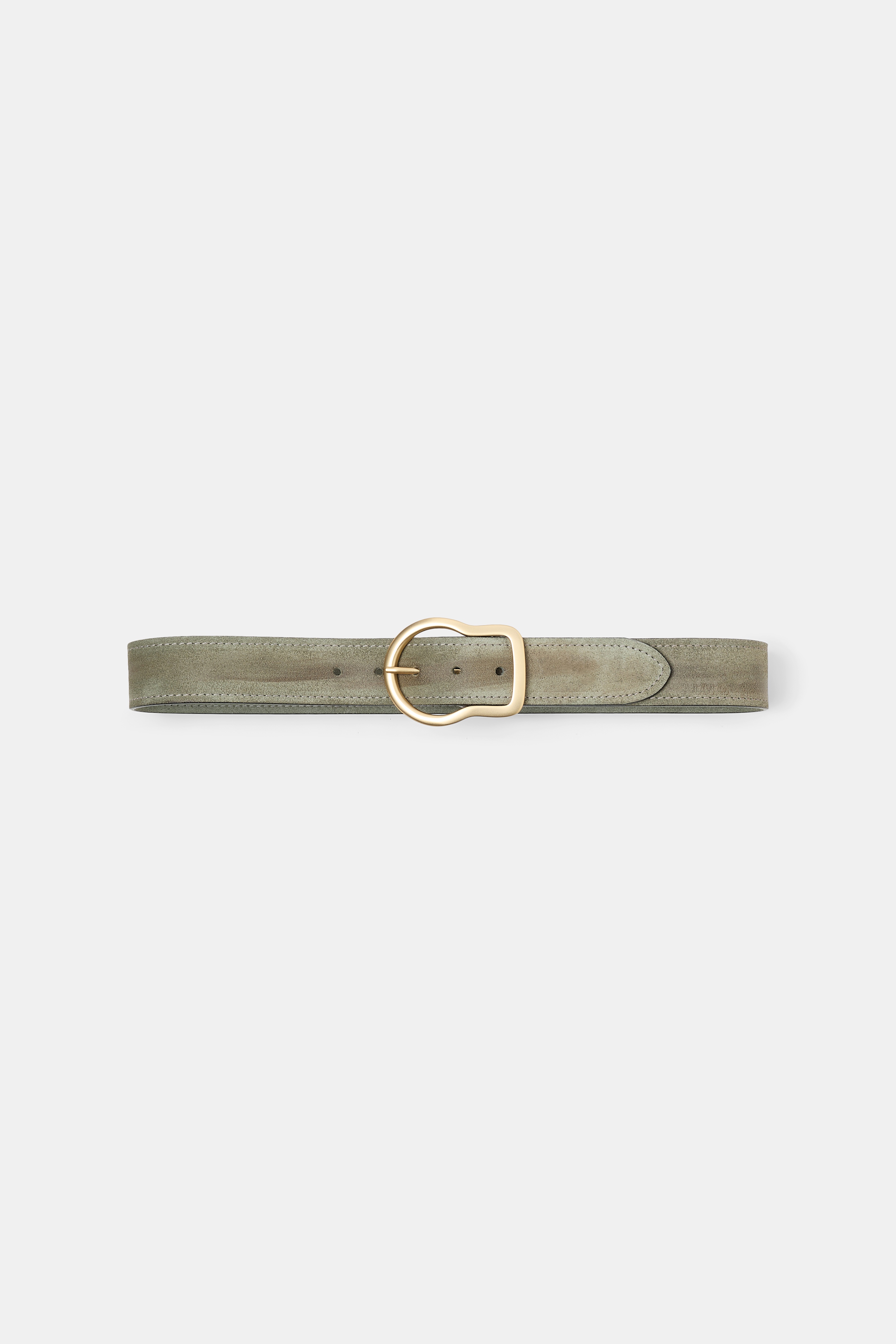 The 4 cm suede belt has a waxed finish and curved shape. Material & Care - 100 % Leather (calf) - Waxed calf suede curved belt - Thick stitching on the edges - Signature buckle - Calf suede lining - Black painted edges Size & Fit - Width: 4 cm - Size measurement taken from middle hole to buckle pin