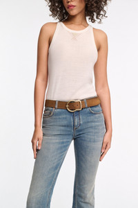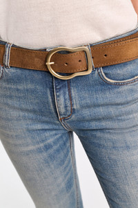 The 4 cm suede belt has a waxed finish and curved shape. Material & Care - 100 % Leather (calf) - Waxed calf suede curved belt - Thick stitching on the edges - Signature buckle - Calf suede lining - Black painted edges Size & Fit - Width: 4 cm - Size measurement taken from middle hole to buckle pin