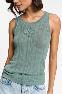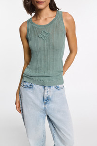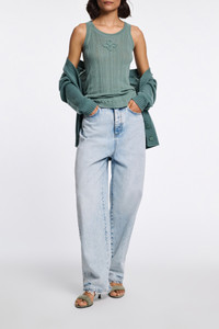 Everything is rosy. The linen blend tank top is ribbed and has a round neckline. The fitted style has D-rose embroidery at the throat and crochet-like ribbed trim. Material & Care - 78 % Linen, 21 % Polyamide, 1 % Polyester - Linen-blend ribbed tank top - Round neckline with tonal D-rose relief embroidery at the front - Ribbed neckline and sleeve opening with ajour effect - Rounded hem with small slits - WE CARE - This item is finished according to STANDARD 100 by OEKO-TEX, 22.0.98928 Hohenstein HTTI - Hand wash cold / Machine wash cold - Wash with similar colors Size & Fit - Our model is 178cm tall and wears a size S - Fitted