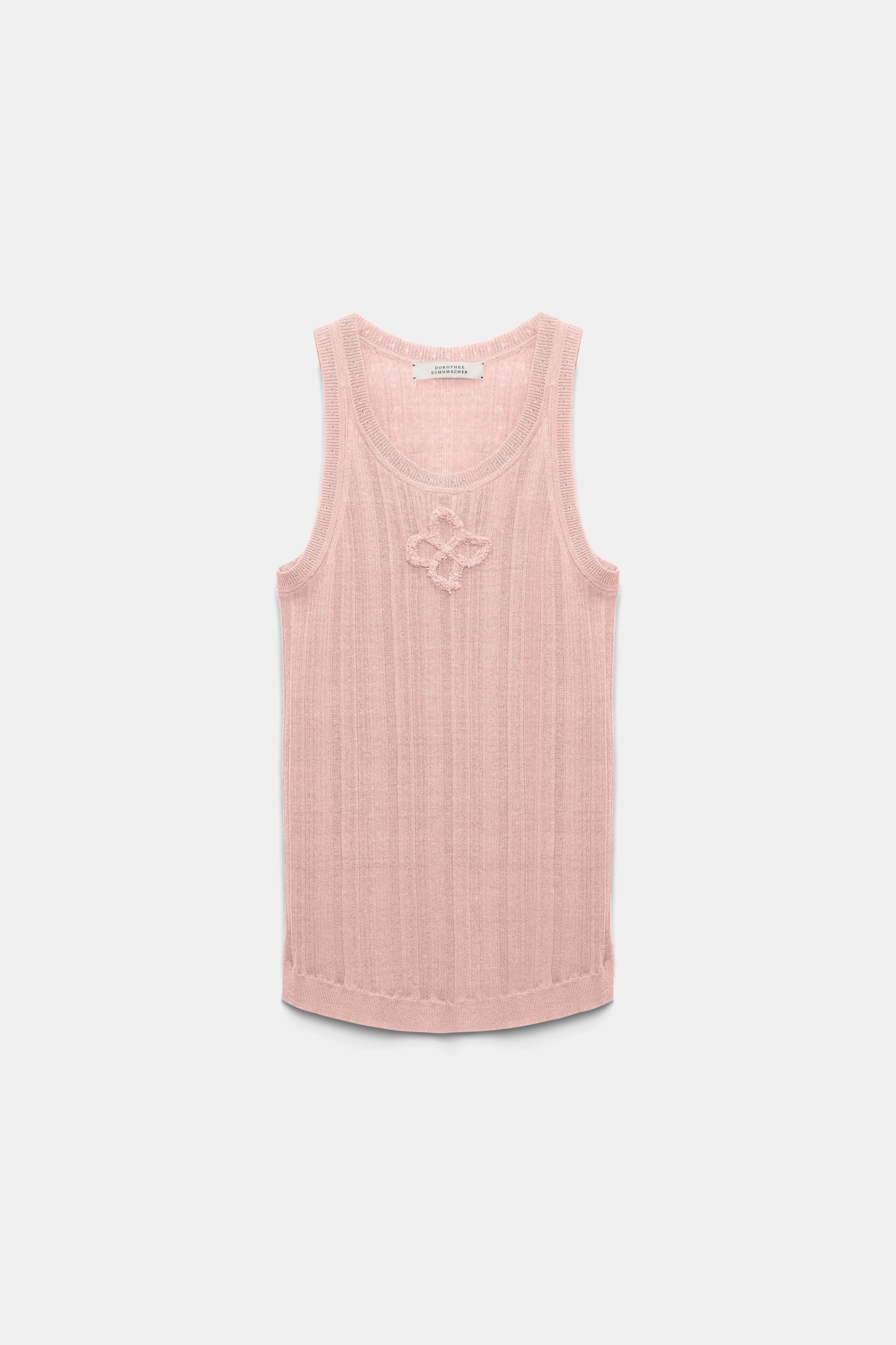 Everything is rosy. The linen blend tank top is ribbed and has a round neckline. The fitted style has D-rose embroidery at the throat and crochet-like ribbed trim. Material & Care - 78 % Linen, 21 % Polyamide, 1 % Polyester - Linen-blend ribbed tank top - Round neckline with tonal D-rose relief embroidery at the front - Ribbed neckline and sleeve opening with ajour effect - Rounded hem with small slits - WE CARE - This item is finished according to STANDARD 100 by OEKO-TEX, 22.0.98928 Hohenstein HTTI - Hand wash cold / Machine wash cold - Wash with similar colors Size & Fit - Fitted