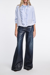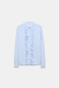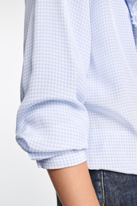 The blouson-style blouse is crafted in gingham print silk-viscose and has ruffle trim on the front. The blouse has a petit rounded collar with contrast button closure and an elastic hemline. Material & Care - 65 % Viscose, 35 % Silk - Blouson blouse with ruffle trim in printed silk-viscose - Gingham print - Petit rounded collar with contrast top button closure - Concealed button placket - Elastic hem Size & Fit - Our model is 179 cm tall and wears a size S - Relaxed fit - Dropped shoulders