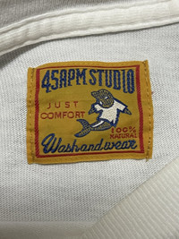 Please read all the description carefully before buying..if you have any questions feel free to ask (check measurements below) Size : please refer to actual measurement given and compared with your best fitting clothes ) Tag read : 45 rpm size - L Measurements Good used condition : 8/10 Please enlarge the photos to get clear image. Measurement taken while laying flat. Armpit : 21”inches Shoulder to shoulder : 20.5”inches Length : 30inches back - front 27”inches Please compare the measurement with your garment. Kindly read my shipping and policies. Shipping may takes around 7 days depends on location. Im using fedex express Please contact us for Expedited Shipping. PLEASE leave ur "phone number" on the note when making an order. Thanks for dropping by. This USED & Vintage Items, So dont expected it to be like NEW Condition!! All measurements are taken with the garment flat on the ground ATTENTION : Please pay close attention to measurements provided. Do not rely on tag size as pre-worn items may have been altered, stretched or shrunk & vintage sizes do not directly translate the modern sizes.The best way to ensure a correct fit is to compare our measurements with the measurements of a similar item that you know fits you well. And please take note,** i will not accept return if u cant fit it. As i already give my manual measurement. Please enlarge the photos for clearer image. ** Please do not expect the shirt in mint condition unless stated.Its because vintage and used items may have sign of wear. Thank you very much for your visit.