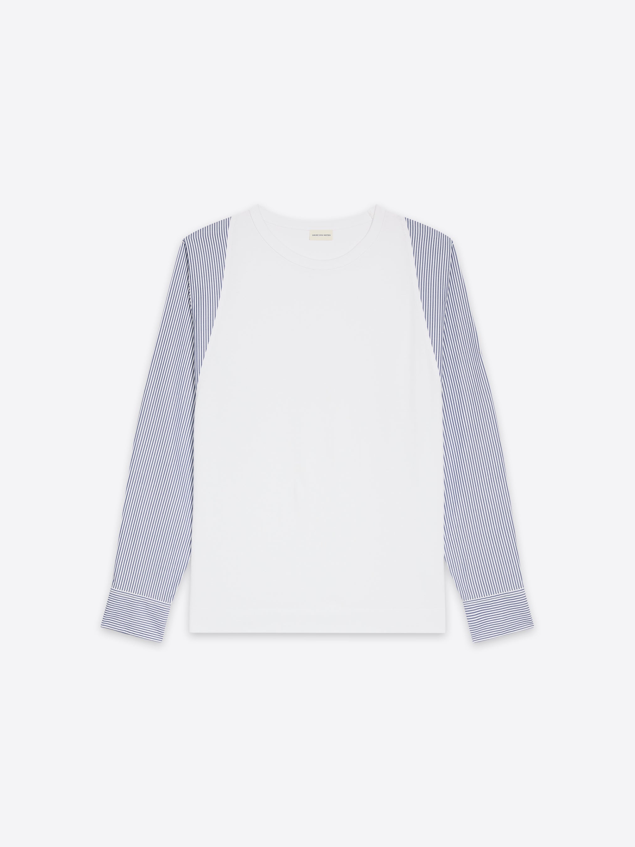 Loose fit long-sleeved T-shirt in cotton, with contrast sleeves in cotton poplin. DETAILS - 100% Heavyweight Cotton. - Contrast shirt sleeves. - Regular fit. Long sleeves. Buttoned cuffs. - Ref: 252-021118-2603 SIZE AND FIT Model is 189 cm / 74.5 inches and wears size M.