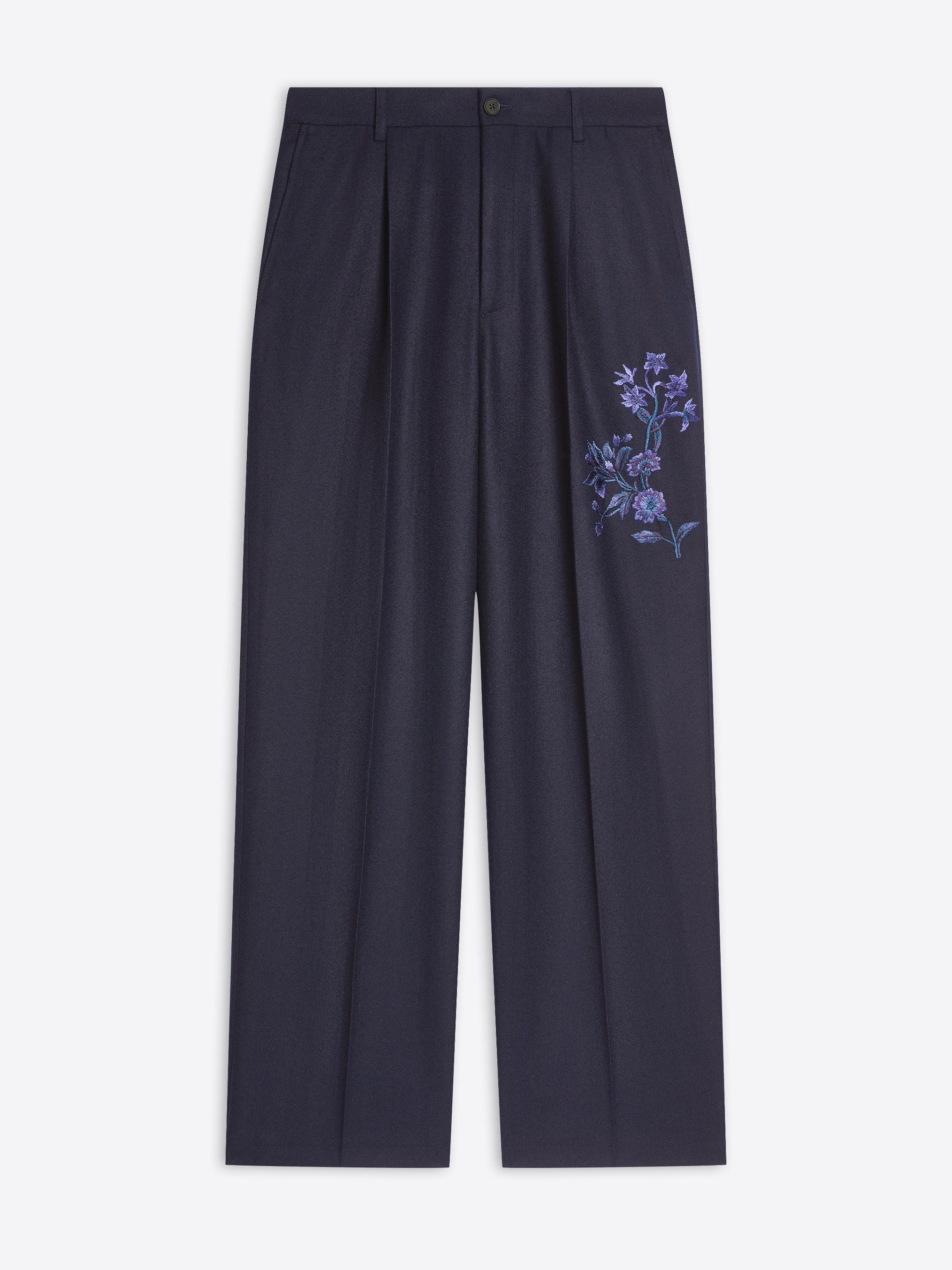 Regular fit, mid-rise straight leg pants in wool flannel with floral embroidery. DETAILS - 100% Wool. - Floral embroidery - Regular fit. Mid rise. Straight leg. Pleated. Side slit pockets and back jetted pockets. Belt loops. Front button and zip closure. - Ref: Regular fit. Mid rise. Straight leg. Pleated. Side slit pockets and back jetted pockets. Belt loops. Front button and zip closure. - Ref: 252-120954-2196 SIZE AND FIT Model is 189 cm / 74.5 inches and wears size 46.