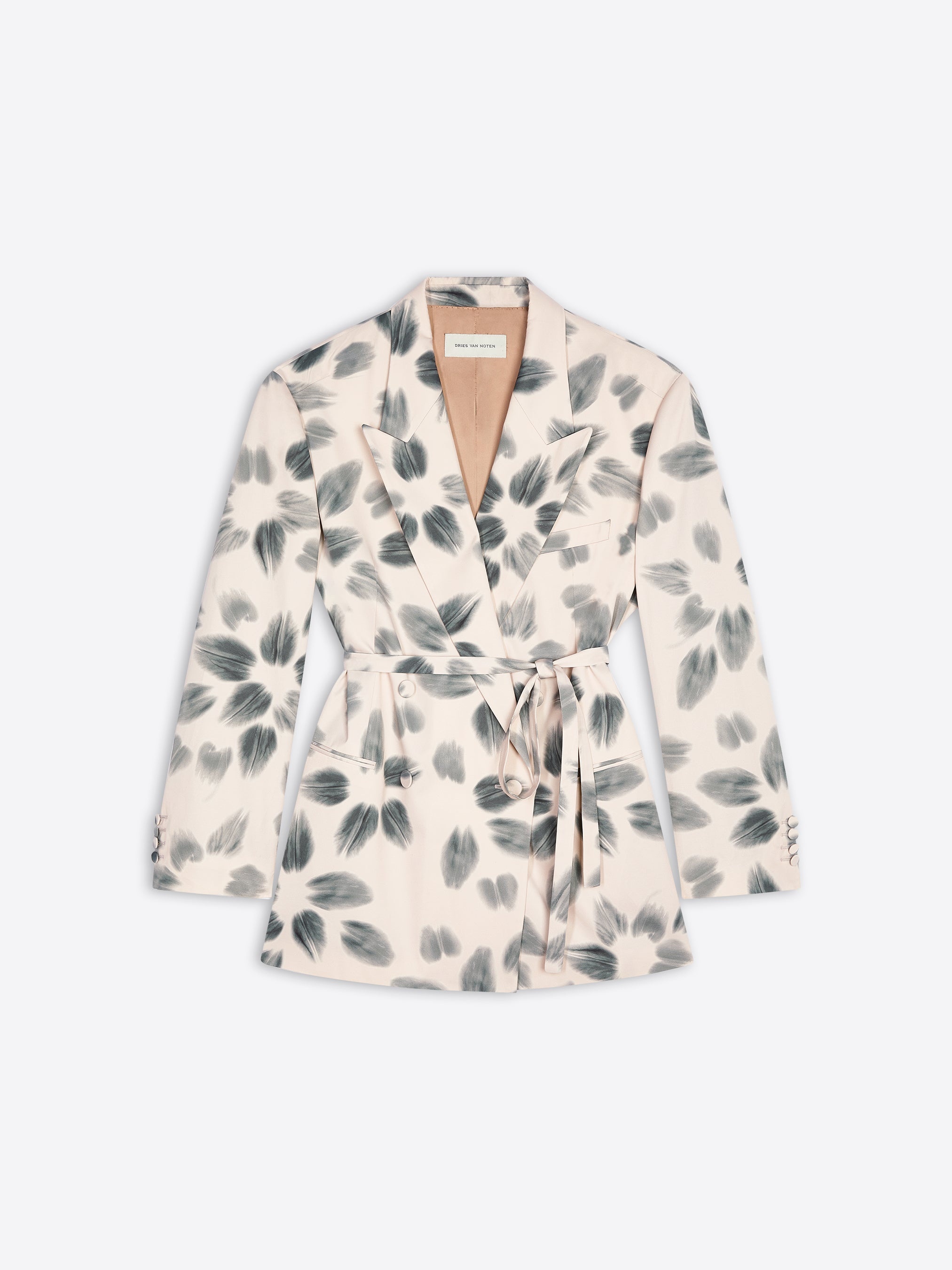 Oversized belted blazer in satin viscose cotton blend, with all-over Tulip Petals print. DETAILS - 55% Viscose, 45% Cotton. Lining: 100% Viscose. - Tulip Petals all-over print. - Oversized fit. Peak lapel. Lined. Double-breasted. Side slit pockets. Buttoned cuffs. Belted. Front fabric-covered button closure. - Ref: 251-070424-1083 SIZE AND FIT Model is 179 cm / 70.5 inches and wears size L.