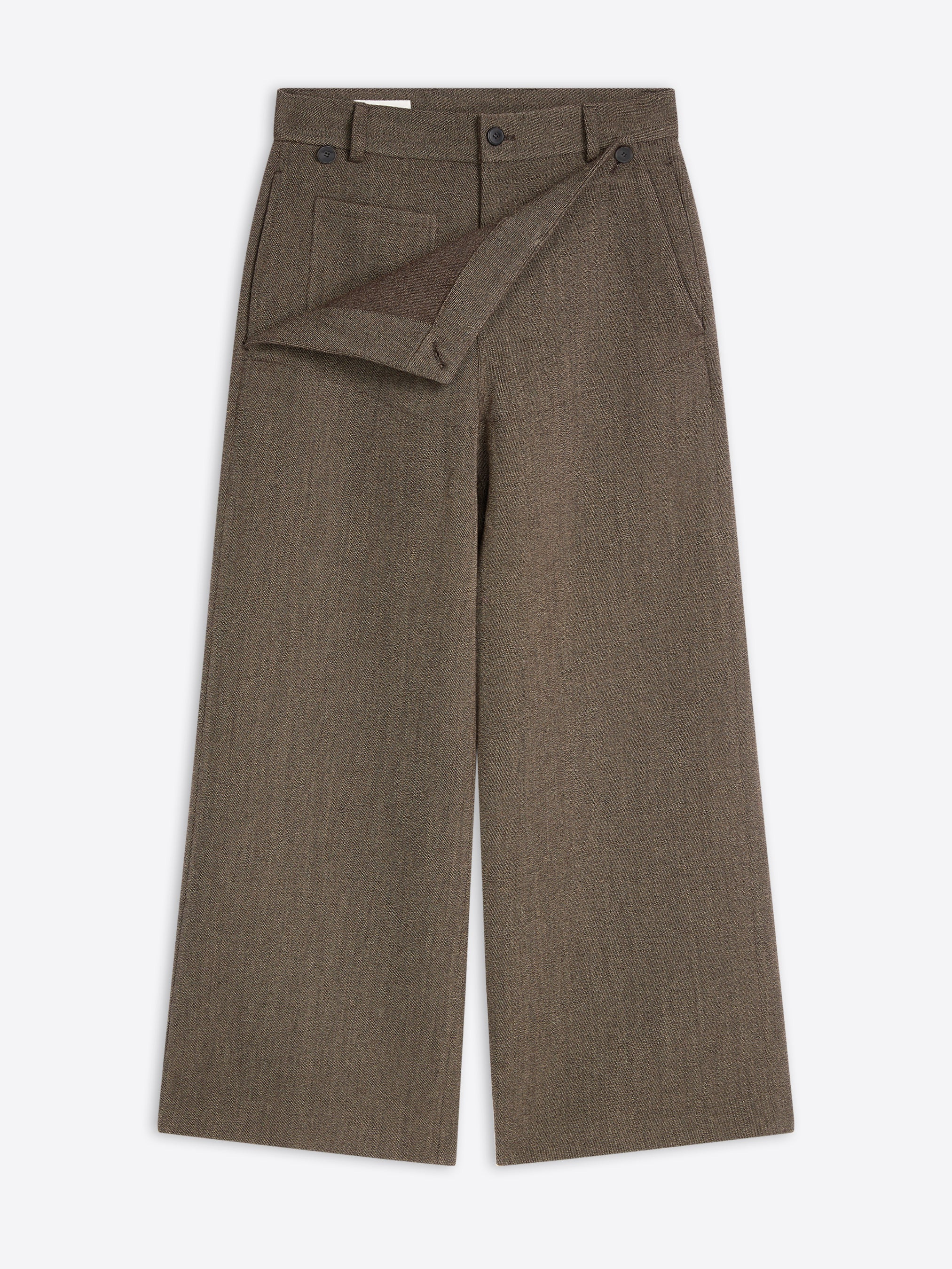 Regular fit wide leg sailor pants with buttonable front flap, in riding wool. DETAILS - 100% Wool. - Buttonable front flap. - Loose fit. Mid rise. Wide leg. Front closure. Side slit pockets. Back welt pockets. - Ref: 252-020983-2197 SIZE AND FIT Model is 189 cm / 74.5 inches and wears size 46.