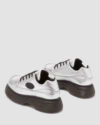 Feel the Buzz. Inspired by our 90s silhouettes, the new Buzz 5-eye shoe grabs attention from top to bottom. It stands on our chunky barrel-edge Buzz sole — marked with DM’s grooving, black welt stitching, and a leaf pattern on the undersole. The statement silver upper is made with soft, Metallic Tumbled leather and has a comfortable padded collar. An inflated, rubberized badge echoes the contours of the sole. Material Metallic Tumble - a naturally tumbled soft Nappa leather with metallic coating. Construction Goodyear Welted - the upper and sole are heat-sealed and sewn together, providing more comfort and durability for years to come. Product code 41795020