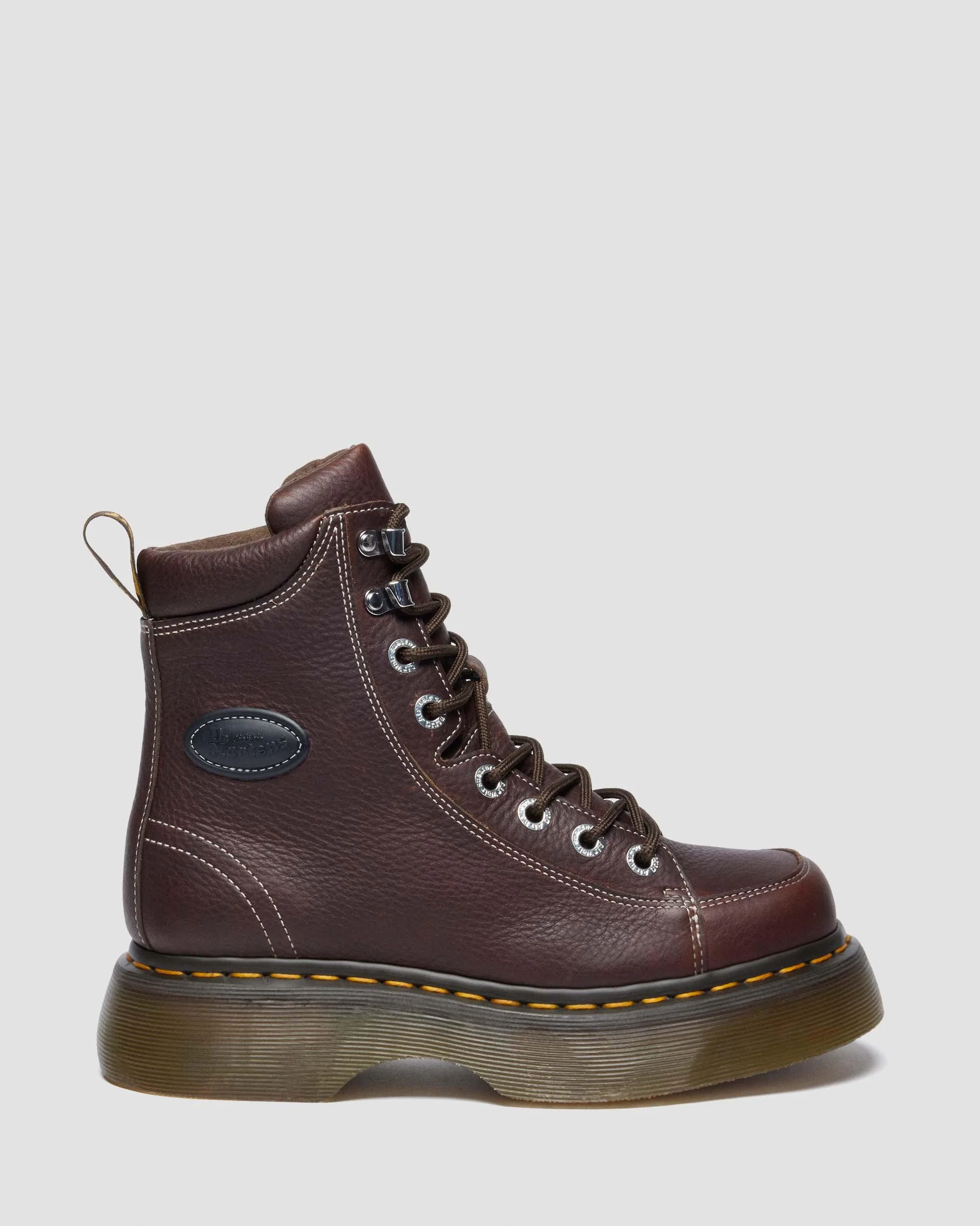 Boot up the Buzz. Our new Buzz 8 eye boot is laced with archive inspiration and a heavy dose of Doc’s DNA. It stands on our chunky, barrel-edge Buzz sole — marked with DM’s grooving, yellow welt stitching, and a leaf pattern on the undersole. The upper is made with soft brown Grizzly leather and detailed with a rubberized brand patch, antique gold eyelets, and contrast stitching. The boot is also fitted with a padded collar —so your first wear will feel as good as it looks. Material Grizzly is a heavyweight leather, with a subtle grained finish. Construction Goodyear Welted - the upper and sole are heat-sealed and sewn together, providing more comfort and durability for years to come. Product code 42033200