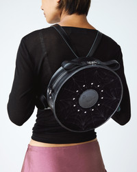 Dark romanticism distilled into a circular backpack. Built from black velvet and grounded with a hard-wearing black Kiev leather base. A spiderweb motif radiates across the front panel in intricate embroidery, punctuated with silver cone studs and debossed DM’s x Wednesday branding. Velvet zip pulls and silver-tone hardware elevate the gothic detailing, while a removable stained-glass window charm channels the eerie elegance of Nevermore Academy. Finished with a hidden back panel pocket and adjustable straps for styling your own way. Material Kiev leather is a modified version of our classic Smooth leather, with a PU coating, polished surface and slight sheen. Velvet is a brushed fabric with a slight pile that features a soft, silky tough and attractive sheen. Product code 43063001