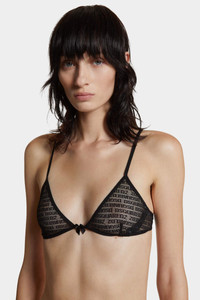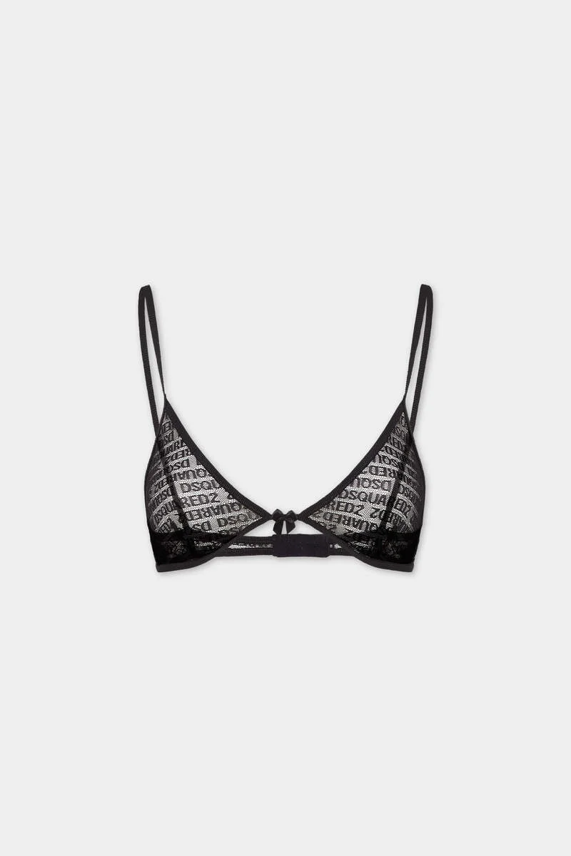 - MADE FROM SHEER NYLON - ALL-OVER DSQUARED2 LETTERING - FRONT BOW DETAIL - ADJUSTABLE CLIP CLOSURE 93% POLYAMIDE, 7% ELASTANE Special occasions call for special underwear. This barely-there triangle bra is made from sheer skin-bearing nylon, embellished with all-over Dsquared2 lettering. Finished with a delicate bow detail.