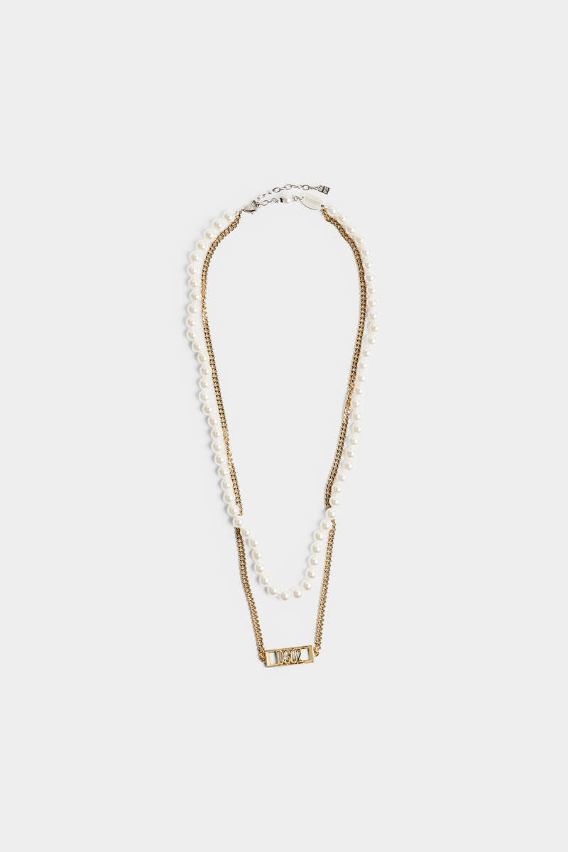 - PRODUCT ID : NEM033413420001M2310UN - PEARL AND METAL CHAIN NECKLACE - ADJUSTABLE LOBSTER CLASP - METAL DSQ2 PLAQUE STRUCT: 15% TIN ALLOY, 55% BRASS, 10% RESIN, 20% GLASS Elegant but edgy in equal measure. The opulence of gold is layered under the timeless elegance of pearls with this double-strand necklace. Finished with a distinctive DSQ2 plaque.