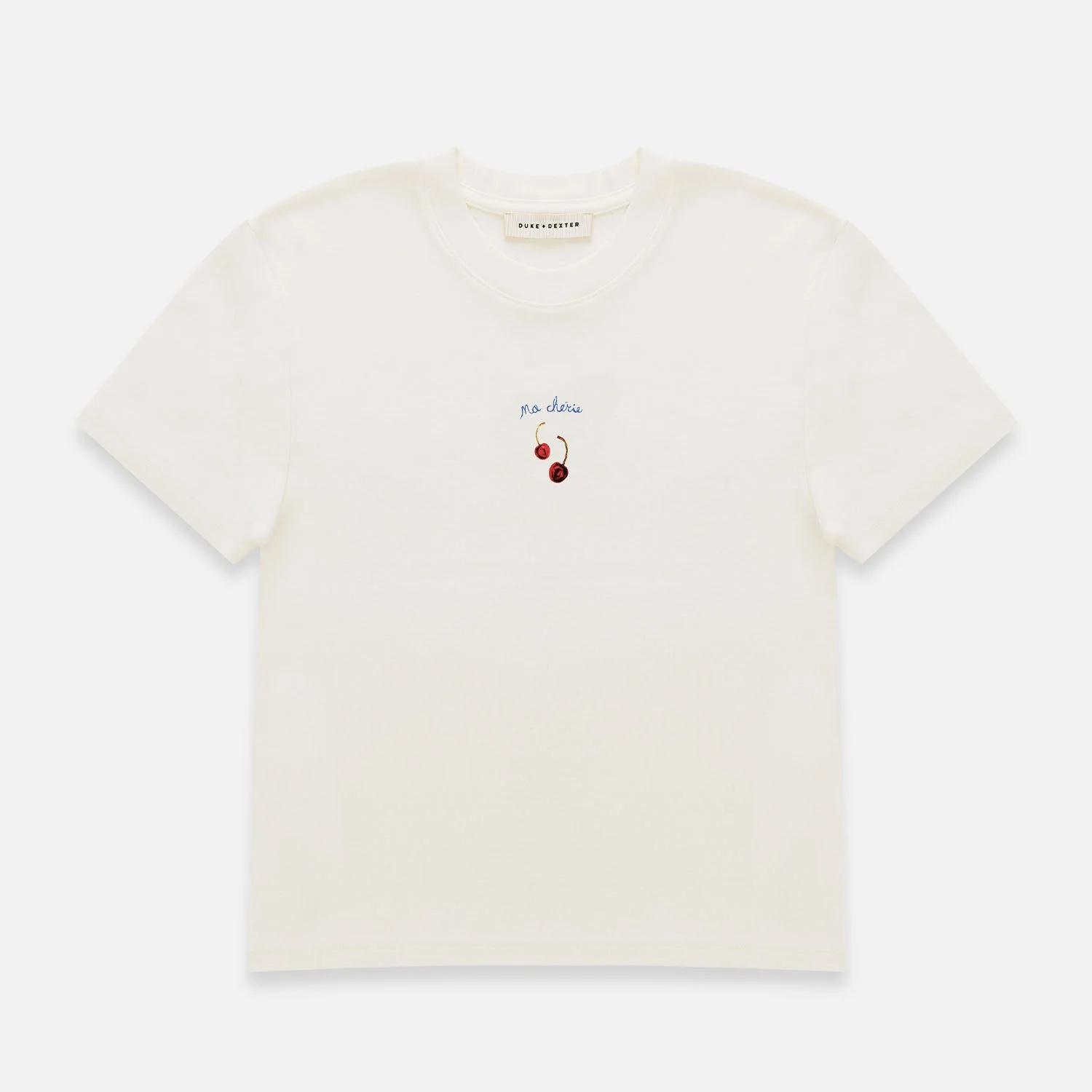 Our Cherry Vintage White Baby Tee is cut for a close fit, like the baby tees of the ‘90s and ‘00s. It’s handmade from a lightweight, custom-knitted jersey and screen-printed with one of our hand-drawn icons, Ma Cherie, at the chest. SPECIFICATIONS Fit Slim Fit Composition 100% Cotton Detail Lightweight custom knitted jersey. Water based screen print on vintage white Packaging All our packaging is made from recycled materials Origin Handmade in Portugal