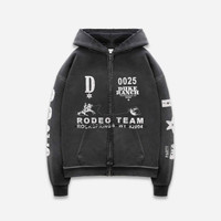 This Vintage Black Hoodie is screen-printed with our Rodeo Team graphic at the front and back. It’s made from heavyweight 420GSM cotton-jersey with a soft, brushed backing and fitted with an antique zip. The fabric has been washed, distressed and sun-faded to feel like an authentic, lived-in piece. SPECIFICATIONS Fit Relaxed Fit Composition 100% cotton Weight 420gsm Detail Custom Knitted. Brushback. Custom fade out with a hand corrosive spray finish. Back yoke panelling. Water based screen prints