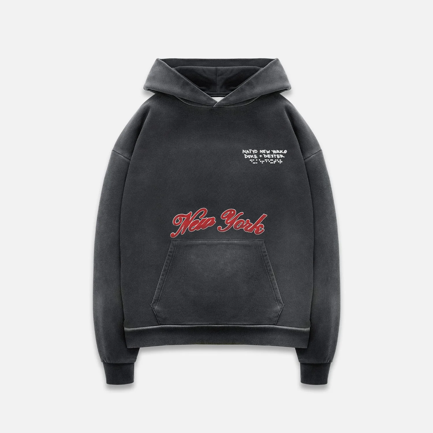 Designed in collaboration with NAIYO, the NY Vintage Black Hoodie released alongside the ‘Blind to the Noise’ exhibition at Mērcer Labs Museum. An ode to the Big Apple, it’s made from mid-weight cotton-jersey that’s washed and faded and detailed with puff-print artwork at the front and back, including a script ‘New York’ graphic and NAIYO’s braille motif. SPECIFICATIONS Fit Relaxed Fit Composition 100% cotton Weight 420gsm Detail Water based screen prints, puff printed. Custom Knitted. Brushback. Back yoke panelling Packaging All our packaging is made from recycled materials Origin Handmade in Portugal