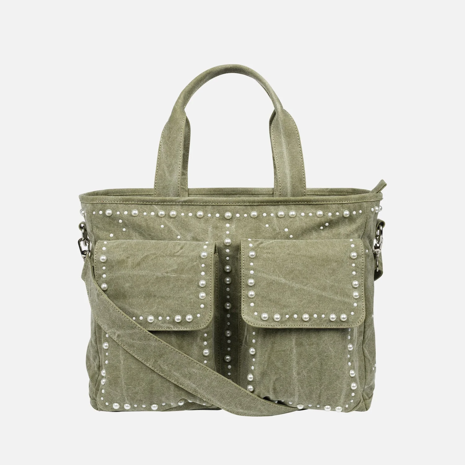 One of our first-ever bags, this Peso Green Pearl Crossbody is made from hard-wearing canvas and covered in faux pearl beads. It’s fitted with a couple flap pockets and a zip-up main compartment with room for your headphones, charger and laptop. The fabric has also been heavily washed to give that aged look and soft feel. SPECIFICATIONS Material 100% Cotton Lining Polyester Detail Washed fabric for an aged look and soft feel. Magnetic flap pockets. Removable adjustable strap Measurements Length 36cm, Height 30cm, Depth 14cm