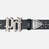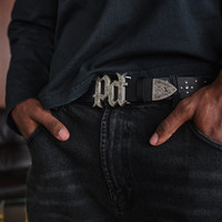 From the D+D X Peso collection, this Black Belt is covered in silver-tone studs from the loop to the end tip. It’s made from black leather and has an etched buckle, cast to resemble ‘P’ and ‘D’. SPECIFICATIONS Material 100% Leather Detail Metal studs, etched buckle