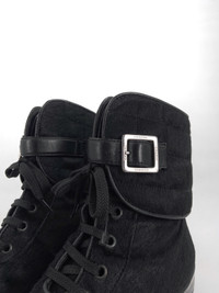 Chanel Fall 2000 Karl Lagerfeld Pony hair Calfskin Logo Quilted Combat boot 38 Size: 38 Notes: From Fall 2000 collection of Chanel designed by Karl Lagerfled Made from pony hair style calfskin Lace-up design with flaps equipped with buckles with Chanel Logo Toe with Chanel logo leather patch Made in Italy Condition: 4/5 (Mint condition, little to no signs of use) Defects: Slight heel drag Price(including shipping): $600