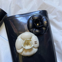 Chanel Karl black floral rainboots Sz:37 An iconic pair of boots from Chanel under Karl direction, 3d plastic petal flower with chanel logo, great for rainy seasons. Slight signs of use. $400