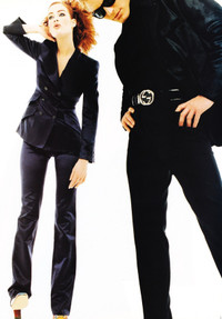 Gucci Fall 1995 Runway Velvet Double-Breasted Blazer 40 From the very beginning of Tom Ford’s career, his second collection with the landmark fall 1995 Gucci collection, that Tom put him self and Gucci to the top of the fashion scene. His 70s-tinged designs pioneered a sexy, super-glam new direction for the brands. The collection includes a majority of velvet garments including this double-breasted blazer that was worn by Meghan Douglas. The jacket is made with velvet liquid like velvet with large sharp shoulders pads. In very good condition, some slight signs of use. A scratch on one of the buttons. Measurements: Shoulders: 16” Chest: 18” Length: 28” Sleeves: 24” $1300