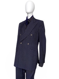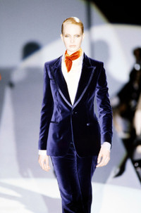 Gucci Fall 1996 Tom Ford Blue Velvet Striped Silk Scarf Neckpiece Length: 49” Width:6” Notes: From one of Gucci’s most important collections, Fall 1996 took Gucci to a whole new plane of prominence, with Vogue proclaiming the collection to be the “fashion equivalent of a one-night stand at Studio 54.” Designed by the legendary Tom Ford, the collection consists of very simple militaristic garments with prominent epaulettes motifs, the collection was one of the finest to come out of the minimalist movement of the 90s Appearing on both womenswear and menswear runways, this neckpiece was featured on multiple looks, as a sort of twilly/ascot accessory Made from a soft rayon silk blend fabric with stripes of velvet on one side Made in Italy Composition: 75% Rayon + 25% Silk Condition: 4/5 (Mint condition, little to no signs of use) Defects: N/A Price(including shipping): $300
