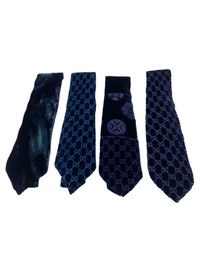 Gucci Fall 1997 Tom Ford Turquoise Monogrammed Velvet Silk Tie Length: 59” Width (widest): 5” Notes: From Fall 1997 Gucci collection designed by the one and only Tom Ford The collection can be summarised as an answer to formal flamboyancy menswear, the collection is highlighted by bright psychedelic colours on a backdrop of sleek black silhouettes, with lush velvet Gucci monogrammed suits and coats, the first great menswear from Tom that truly stands on its own This tie was featured on multiple looks throughout the collection, in a lush dark turquoise colour with a all-over Gucci monogram Tie is made from a rayon silk blend, the end of the fabric is rolled and sewn by hand, the velvet fabric is extremely thick and might prove difficult to tie into a tie Made in Italy We have various ties from this collection, feel free to check them out *The fifth photos showcases a different tie in navy colourway, it is not this turquoise Composition: 50% Rayon + 50% Silk Condition: 4/5 (Mint condition, little to no signs of use) Defects: N/A Price(including shipping): $300